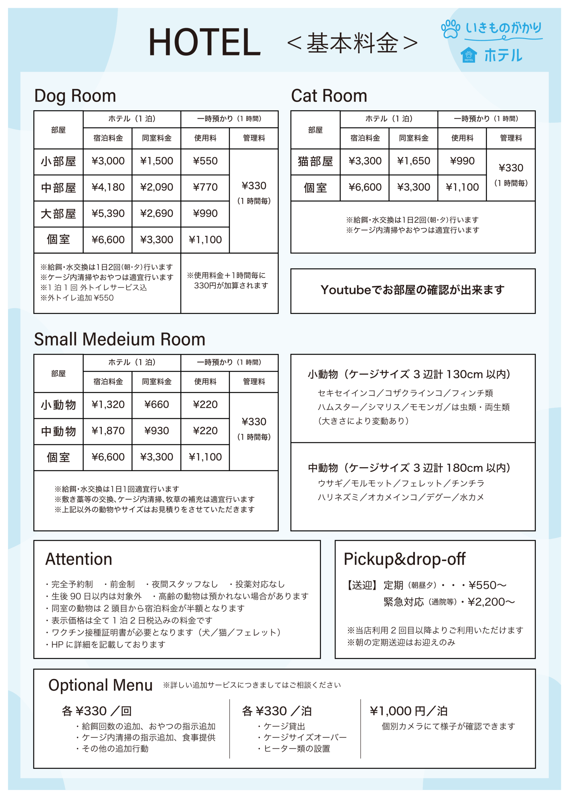 オールジャンルペットホテルで犬・猫・その他と各部屋を用意してあります。